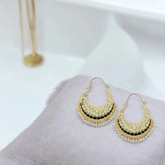 Antique Gold Filigree Chaand Bali Earrings for Women - Black Meenakari Hoop Design