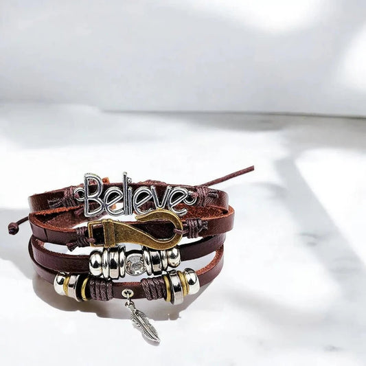 Believe Brown Leather Beaded Multi-Strand Bracelet for Men with Charm