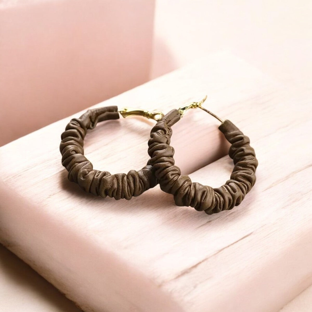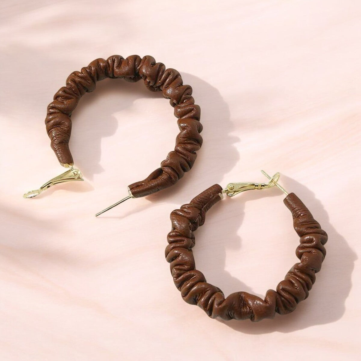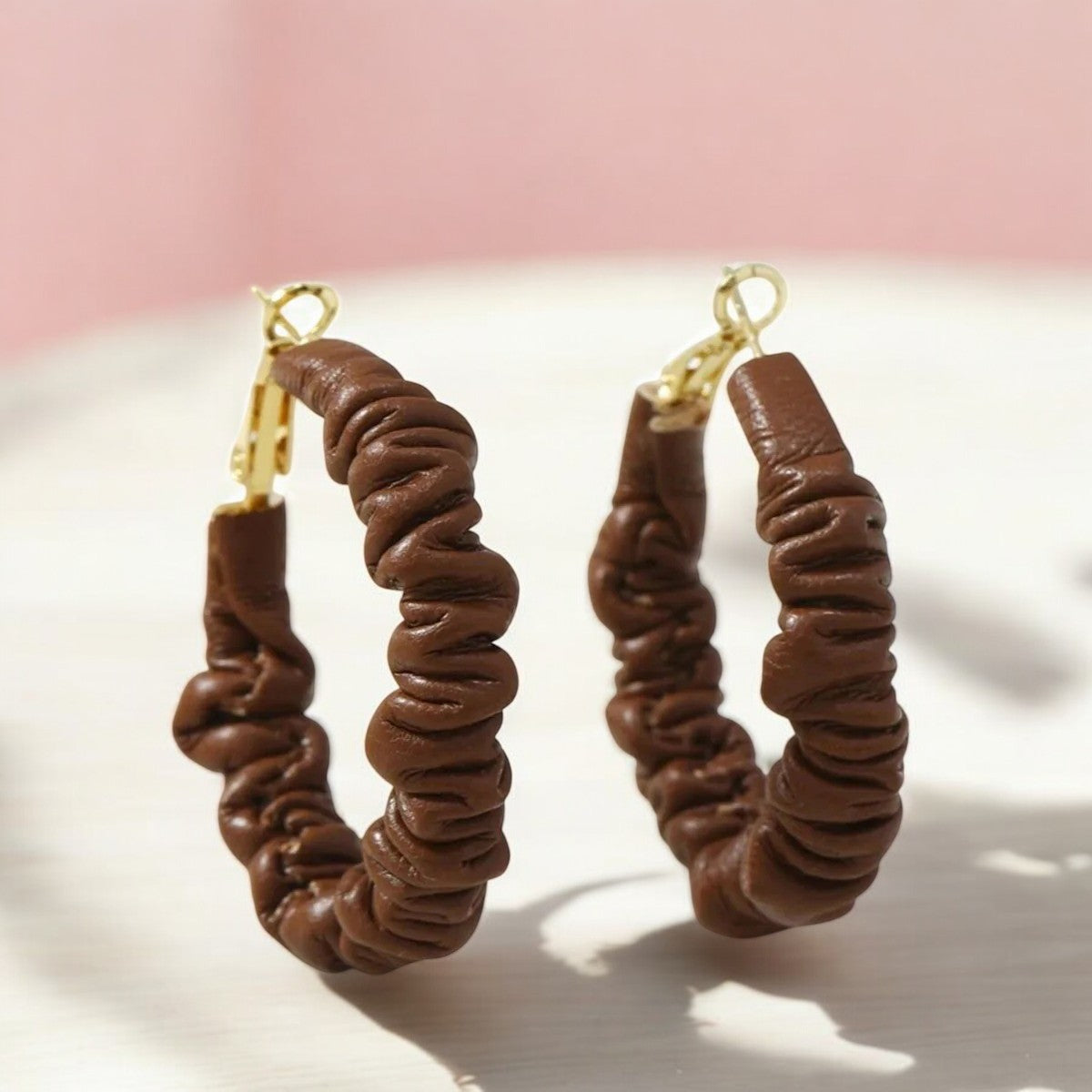 Chocolate Brown Leather Hoop Earrings for Women – 18K Gold Plated, Anti-Tarnish & Stylish